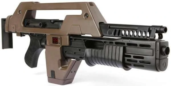 The M41A Pulse Rifle hails from James Cameron's Aliens, as an assault rifle used by the United States Colonial Marine Corps of the late 22 century. It was a select-fire weapon, capable of 4 round bursts for ammo conservation and of course, the use of full automatic fire for it's primary fire mode. The primary ammunition of the gun consists of a 10×24mm Caseless M309 standard light armored piercing round, designed to explode after penetrating armor. It's cyclical rate of fire consists of up to 900 rounds per minute, with an effective range of up to 500 meters and a maximum range of 2,100 meters. The length of the rifle is 69.5 cm with the stock retracted and 84.0 cm with the stock extended.